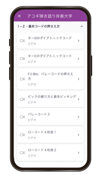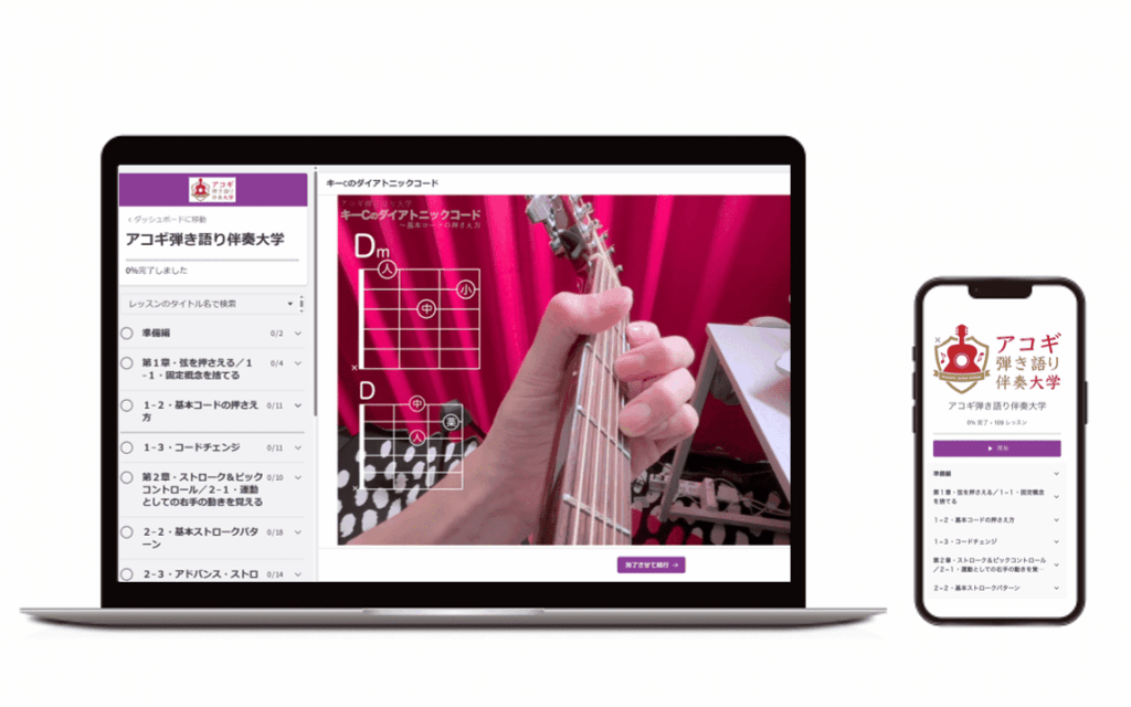 アコ大は左手で弦を押さえるという初歩的なところからスタートして、徐々にできることを増やしていき、最終的にはアコギ1本で自由に弾き語り伴奏をできるようになるためのカリキュラムです。僕自身もこれまでに数えきれないほど初心者の方にレッスンをしてきましたし、その経験をアコ大に落とし込んでいます。